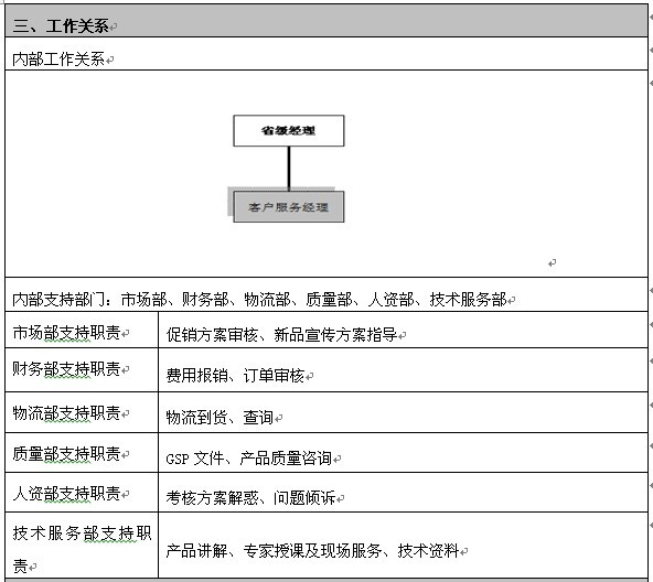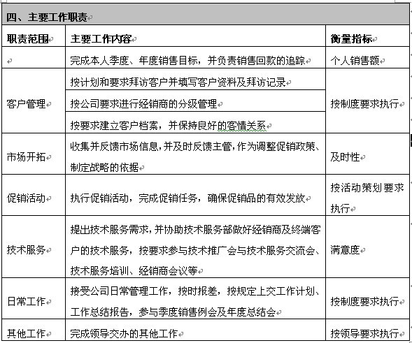 上述案例的结论是:岗位说明书的实际功能是让销售人员明白自己为了达成目标要做什么?公司内部有哪些资源可以支持他达成目标?除此两方面外的其它内容,对于岗位操作人员都是无效的。因此,岗位说明书的格式及内容,做到简明有效就好。