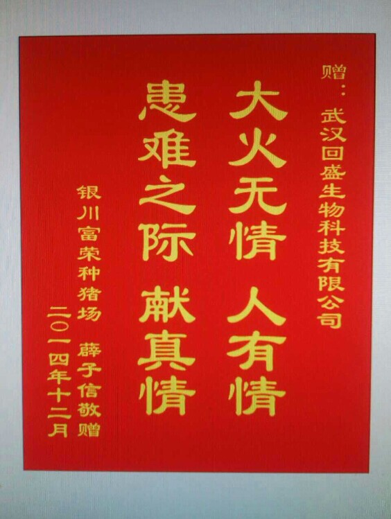 首先,请允许我代表宁夏银川富荣种猪场全体同事对以诚为本赢在诚信9001公司表达最衷心的感谢!2014年12月9日深夜两点,由于线路老化种猪舍不幸失火,直接损失经产母猪88头,后备母猪200头,300多平米的种猪舍毁于一旦,经济损失达70万余。