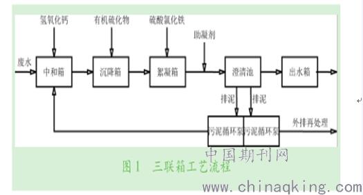 三聯(lián)箱技術(shù)作為國內(nèi)的脫硫廢水處理應(yīng)用比較多的一種工藝技術(shù),包含“絮凝—沉淀—中和”,具體工藝流程如圖1所示。脫硫廢水經(jīng)加堿(氫氧化鈉或氫氧化鈣)中和后,再加入有機硫、硫酸氯化鐵等絮凝劑以及助凝劑等藥品將脫硫廢水中的懸浮物及重金屬沉淀去除。沉淀的污泥經(jīng)脫水處理后運至渣場進行綜合處理,處理出水則經(jīng)pH調(diào)節(jié)后進行排放。三聯(lián)箱技術(shù)是國內(nèi)普遍采用的脫硫廢水處理工藝,廢水含固量大成為制約該工藝發(fā)展的重要因素,不僅導(dǎo)致設(shè)備故障率高,運行穩(wěn)定性差,而且需要添加大量藥劑,增加運行成本。